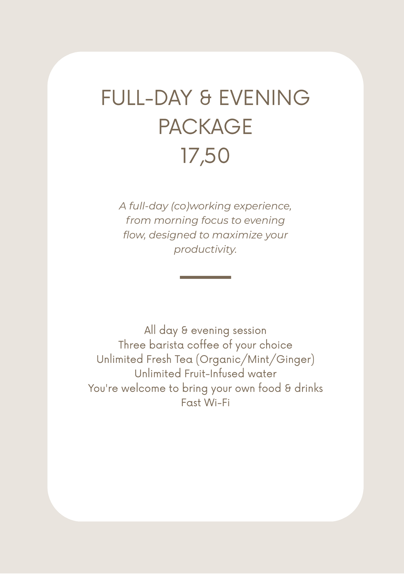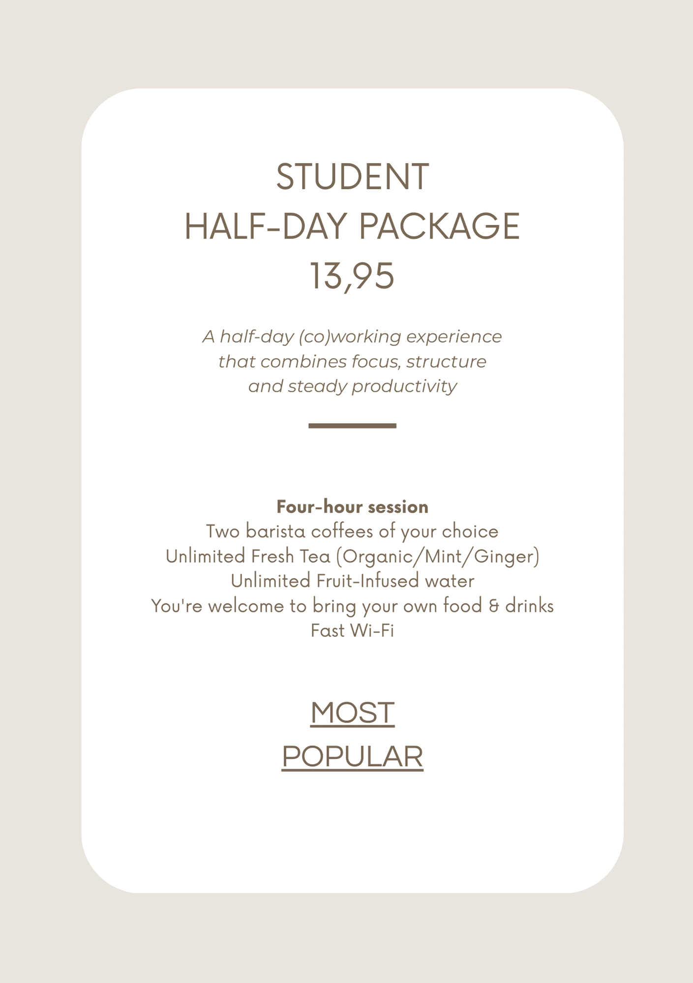 Share a story on Instagram or TikTok (visible for at least 24 hours) and get 50% off your favorite take away coffee or your hourly visit time. Super easy, just follow these 3 steps: